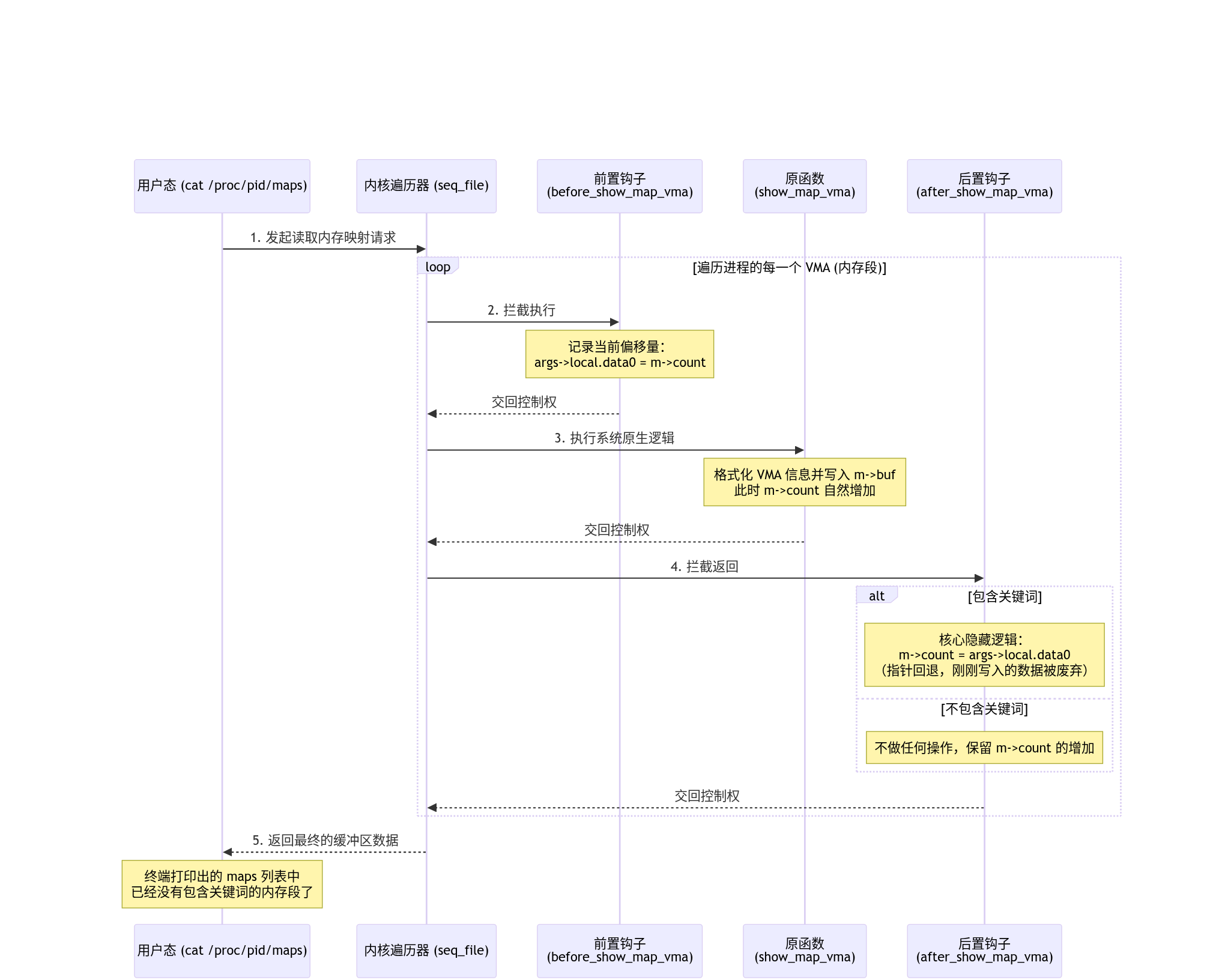 我们需要 hook 一个内核函数叫 show_map_vma,这个函数是 Linux 系统下有程序读取 /proc/[pid]/maps 时,负责将相关信息写入这个文件的函数,只需要 hook 这个函数并改变它的行为,用户态的程序就无法察觉